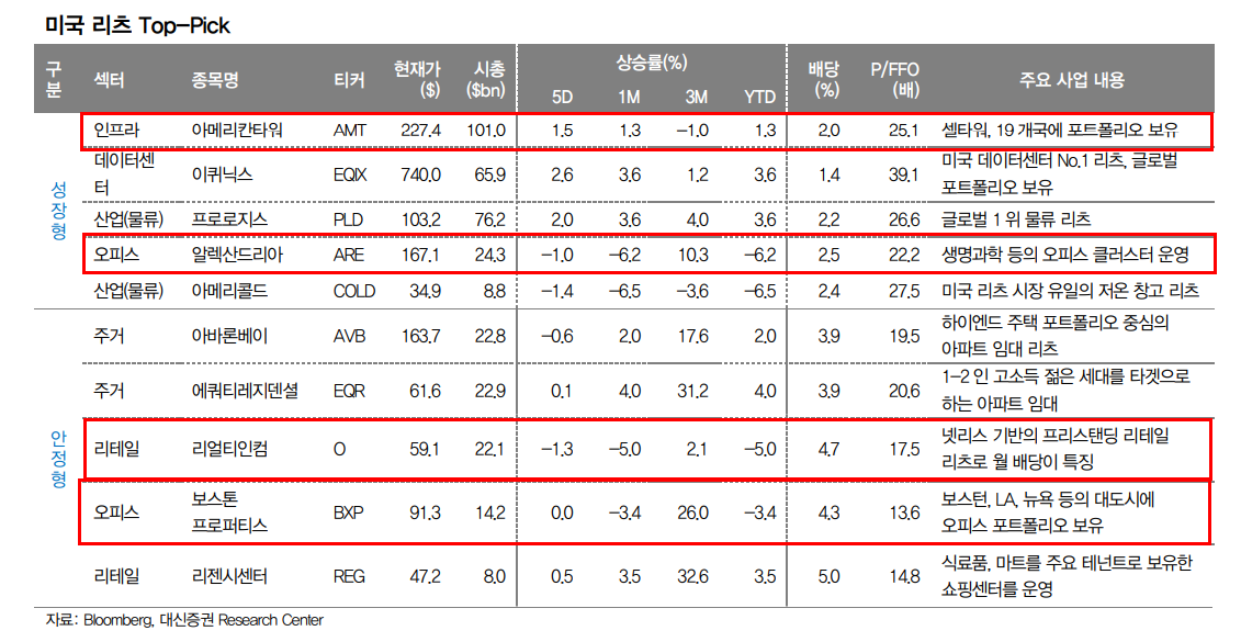 모기지 리츠(mREITs)를 제외한 지분형 리츠들의 평균 P/FFO는 약 17.5x 수준이다. 배당수익률은 약 3.93% 평균 수준.