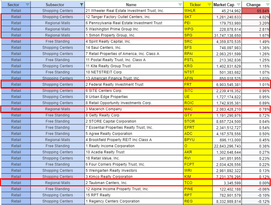 - 현재 미국 리츠 상승장의 랠리의 주역이 되고 있는 리테일 리츠는 Regional Mall 및 쇼핑몰 리츠를 필두로 대거 상승하고 있다. 다만 이는 지난 게임스탑(GME) 숏스퀴즈 사태(위 링크 참고)에 따라 폭락했던 탠저 팩토리(SKT), 워싱턴프라임(WPG) 등의 일시적 기술적 반등에 의한 가능성도 있으므로 조심할 필요 있다고 본다.