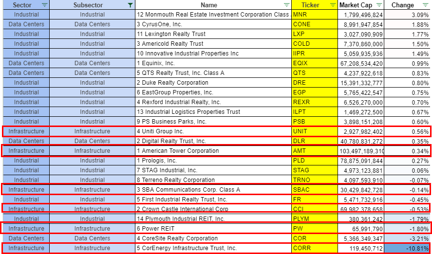 - 전체적으로 데이터센터 리츠와 셀타워 등 인프라스트럭쳐 리츠는 큰 상승세를 보이지는 못했다. 아메리칸타워(AMT), SBA커뮤니케이션(SBAC), 크라운캐슬(CCI) 등의 셀타워 리츠는 혼조세를 보였다.