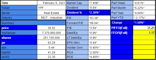 - 특히 아메리콜드(COLD)와 같은 콜드 체인 물류창고(저온물류창고) 업체와 같은 리츠는 앞으로 신선식품 시대 글로벌 개막에 따라 주목해볼만하다고 느낀다. 다만 Trailing 12 months 기준 P/FFO는 약 31.21x로 평균 리츠 17x, 프롤로지스(PDL) 24x 수준에 비해서도 약간은 높은 가격대라는 것은 염두어해두어야할 듯하다