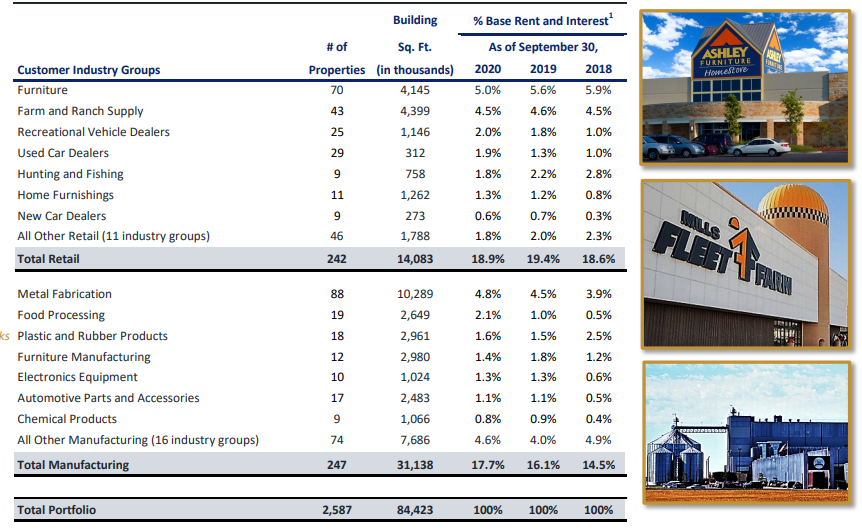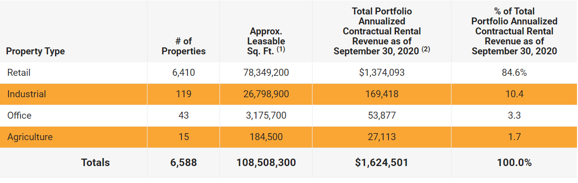 스토어캐피탈(STOR) 역시 다양한 프리스탠딩 리테일 스토어와 그밖에 Industrial Parks에 자리한 제조 관련 자산을 보유하고 있다. 총 자산 수는 약 2,600개 정도로 리얼티인컴(O)과는 큰 차이가 나지만 여전히 많은 수준의 자산을 보유하고 있다.