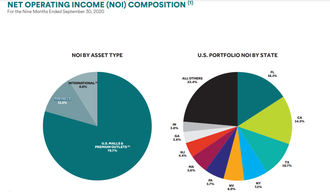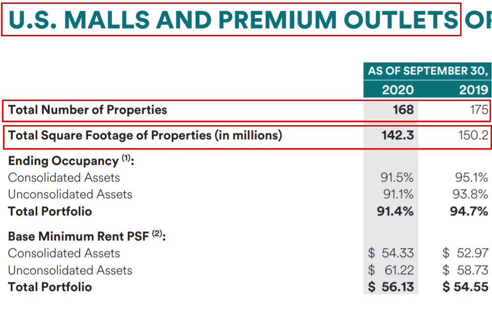사이먼프로퍼티(SPG)의 NOI 포트폴리오를 보면 대부분이 미국 몰과 아울렛 등으로 이루어져 있다. 이 중 미국 및 지역몰 자산의 숫자는 160개를 넘는 수준이고 면적으로 따지면 140mn sqft를 넘는 수준이다.