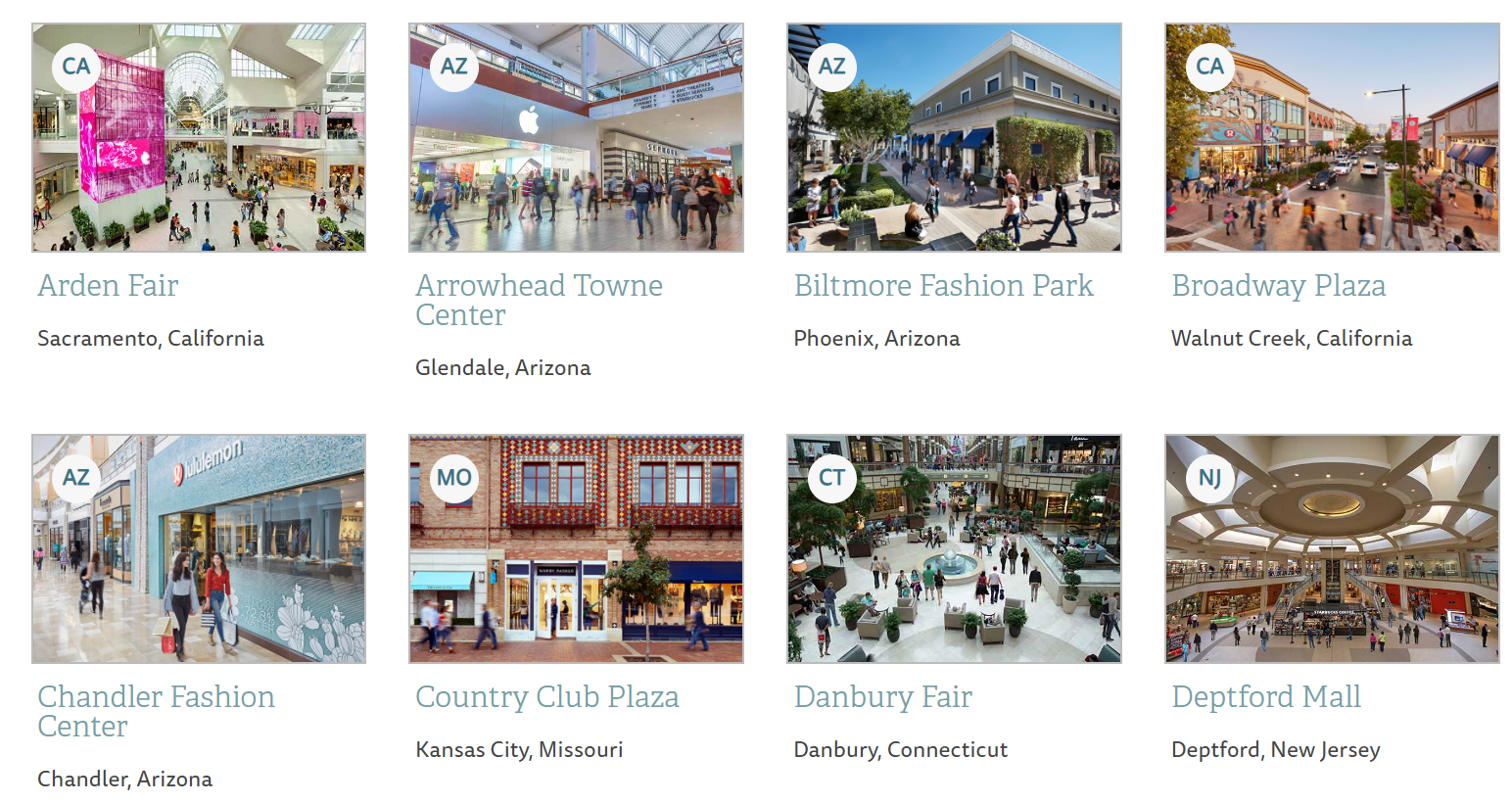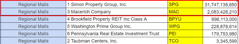 시총 2위 규모의 메이서리치(MAC) 또한 쇼핑몰 등을 담고 있는데, 이에 더해서 메이서리치(MAC)는 쇼핑센터(쇼핑몰 또는 여러개의 상점들로 이루어진 흔히 말하는 도심지의 쇼핑센터 구역들) 와 일부 프리스탠딩 스토어 또한 포함하고 있는 것으로 보인다.