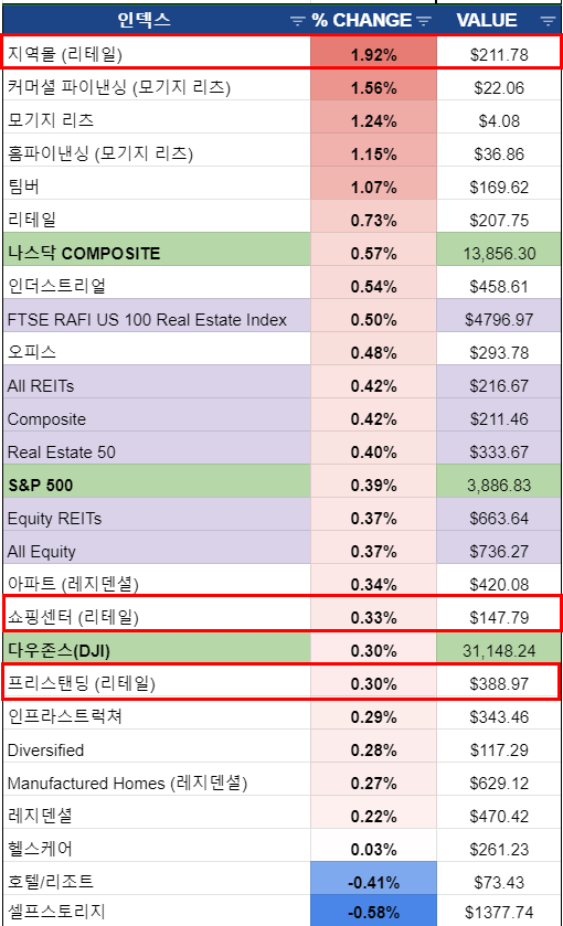 - All 리츠는 약 0.42% 상승, All Equity 리츠는 약 0.37% 상승으로 미국 리츠 시장의 랠리는 계속되었다. 이는 경기 상승에 대한 기대감과 더불어 최근 실적 시즌에 의햔 영향이다. - 상승랠래의 가장