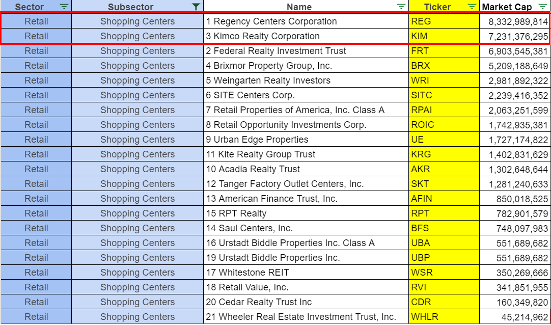 쇼핑센터 리테일 리츠하면 생각나는 것은 무엇보다 리젠시 센터(REG)와 킴코 리얼티(KIM)이다. 앞에서 간략하게 설명했듯이 쇼핑센터는 우리가 흔히 말하는 도심지의 쇼핑구역을 말한다. 쇼핑센터 리츠는 그러한 도심지 등에 위치한 쇼핑센터에 위치한 여러개 외부 리테일 자산 등을 소유하고 있는 리츠다. 물론