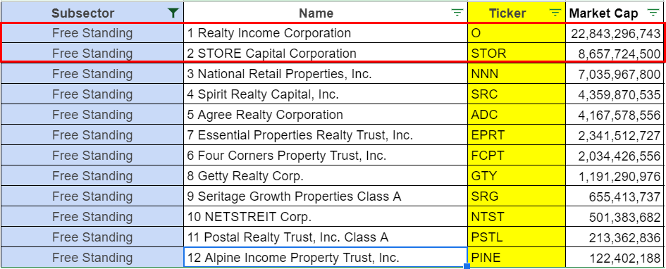 프리스탠딩 리츠의 대장주이자 대표는 무엇보다 우리의 월배당 리츠 리얼티인컴(O)이다. 그밖에도 스토어캐피탈(STOR) 등이 있다.