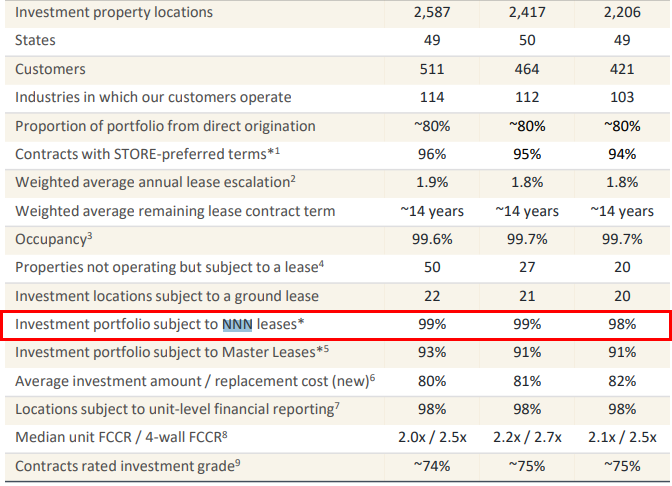스토어캐피탈(STOR)의 자산 임대차 현황을 살펴보면 프리스탠딩(Freestanding) 스토어를 왜 넷리스(Net Lease) 리츠라고 부르는 지를 알게 된다. 투자 자산의 약 99% 이상이 바로 트리플넷(NNN)으로 맺어져있다. 이를 통해서 스토어캐피탈(STOR)은 많은 고정비를 아끼고, 순임대료만 받으면서 안정적인 운영을 유지할 수 있다.