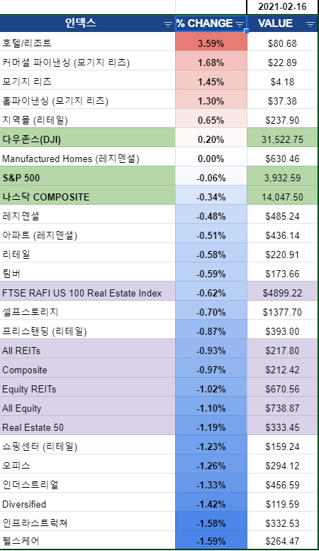 미국 리츠 시장(2021.02.17) - 모기지 리츠 하락, 셀프스토리지(퍼블릭 스토리지, 엑스트라 스페이스 스토리지 등) 상승 (1) | 2021.02.18 |