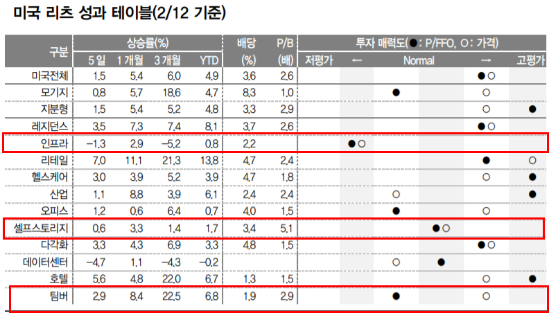 - 셀프스토리지는 중립. 다만 셀프스토리지 초과 공급 국면이 2021년에 해소되고, 제2의 레지덴셜로서 주택산업 호조에 따른 수요 증가로 어느정도 호조가 예상됨. 또한 빠른 임대료 상승 주기로 인플레이션 상승 사이클에서 역시 방어가능할 것으로 예상됨.